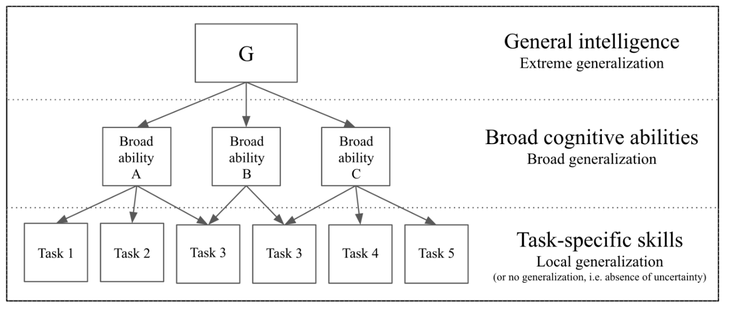 Беря за основу вот эту диаграмму, François Chollet предлагает определять следующие уровни интеллекта по линии универсальности проблем/задач, которые он может научиться решать: