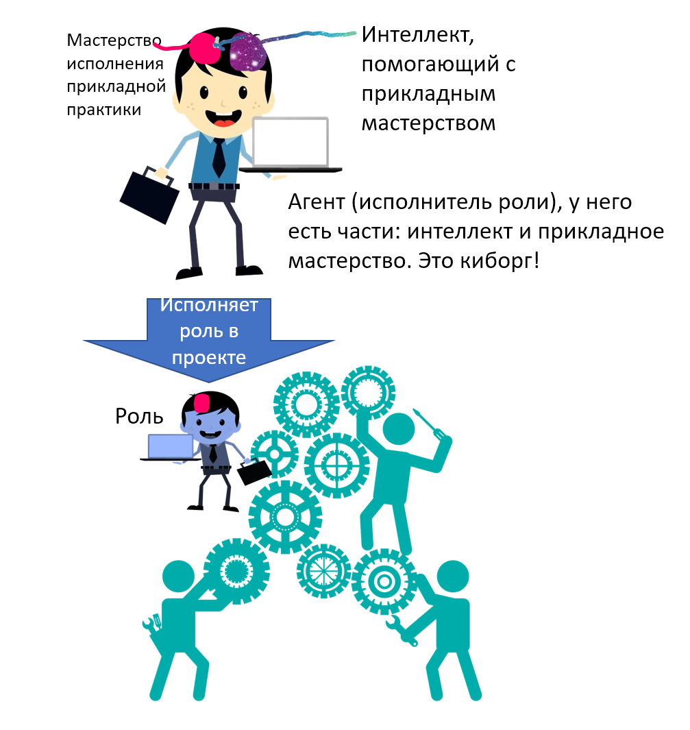 Вспомним игровую метафору. Мышление как работа интеллекта нужно, чтобы научиться играть разные проектные роли в проектах, как в ролевых играх. Мастерство в каких трансдисциплинах, исполнение каких ролей даст нам мастерство в мышлении, то есть мастерство справляться со всё новыми и новыми ситуациями, с новыми и новыми задачами? Ведь каждый раз, когда нам нужно зайти в проект, интеллект должен выбрать подходящее мастерство, сориентировать агента на занятие роли, далее следить, чтобы не было проблем. То есть мы видим агента-киборга внутри проекта в какой-то роли