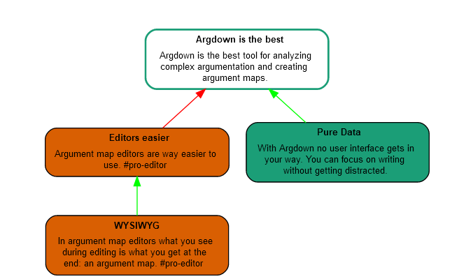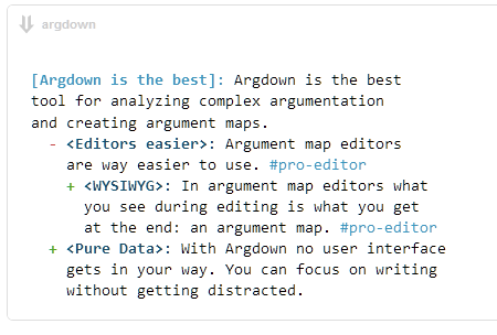 Тот же процесс идёт с софтом Argument Maps (это на сегодня десятки программных средств). Как пример — софт Argdown[6], в котором предлагается простой текстовый язык для описания графов-деревьев аргументации. Основное время работа с аргументацией идёт в режиме текстового представления, но затем для иллюстративных целей программы могут это представление отображать в виде диаграммы, при этом визуальное представление не главное. Вот текст с аргументацией того, что Argdown — это лучший инструмент для изучения сложной аргументации: