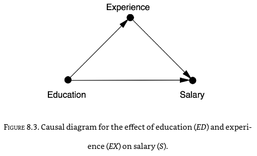 Есть множество самых разных теорий причинности[13], используемых при объяснениях, но современные теории предполагают использование формальных моделей причинности в виде графовых вероятностных моделей, где узлами графа являются какие-то факторы, а стрелки причинности указывают направление влияния этих факторов друг на друга. На английском graphical, на русском — это графовые модели, а не визуальные/графические! Не думайте, что причинная логика использует именно диаграммы, «графические модели». Нет, не диаграммы: речь идёт о графах, которые можно а) нарисовать как узлы и рёбра, б) задать матрицей связей, в) задать списками узлов и связей и т.д. Начинается всё с простых моделек типа вот таких причинных соотношений между образованием, опытом работы и уровнем зарплаты: